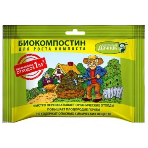 Компостин Счастливый дачник 45 гр используется для роста компоста. Убирает запахи от перепревающего компоста, ускоряет разложение и образование гумуса. Эффективен при температуре выше +10°С. Одного пакета 45 гр. хватает для переработки до 1 м³ органических отходов. Срок полного созревания компоста 6-8 недель. Приготовленный раствор необходимо использовать в течение одного дня. Преимущества: — быстрое перегнивание скошенной травы, опавшей листвы и пищевых отходов; — ускоренное формирование компоста; — уничтожение семян сорняков; — экологически безопасен для человека, животных и растений.
