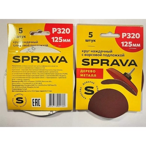 Круг наждачный 125мм. с ворсовой подложкой. SPRAVA.уп.(5шт) Р320 для угловых и эксцентриковых шлифовальных машин, оснащенных соответствующими насадками. Подходит для шлифовки древесины, древесных материалов, металла, шпа... Читать далее...