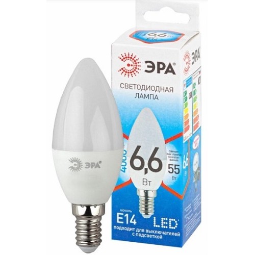 ЭРА QX LED-6.6 Ват-В35-4000K-E14 Лампа светодиодная свеча (арт.B35-9W-840-E14) используются в потолочных, настенных, настольных светильниках, в люстрах и бра.