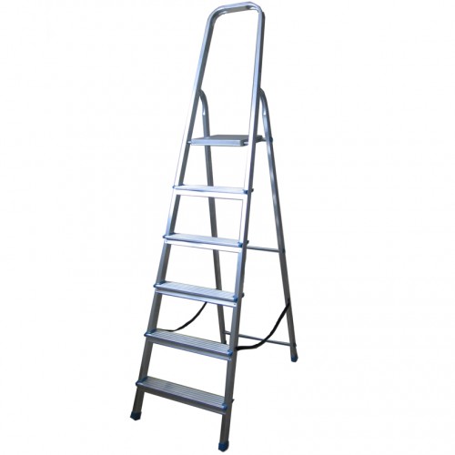 Лестница-стремянка на 6 ступеней подходит для использования при монтажных и ремонтных работах. Выполнена из алюминия с толщиной профиля 0,12 м. Высота до верхней ступени достигает 1,26 м. Прорезиненные наконечники предотвращают скольжение во время эксплуатации. Габариты лестницы-стремянки 1,98 м.