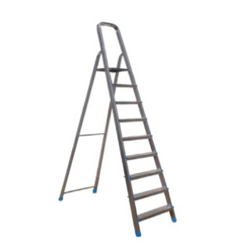 Лестница-стремянка на 10 ступеней подходит для использования при монтажных и ремонтных работах. Выполнена из алюминия с толщиной профиля 0,12 м. Высота до верхней ступени достигает 2,1 м. Прорезиненные наконечники предотвращают скольжение во время эксплуатации. Габариты лестницы-стремянки 2,9 м.