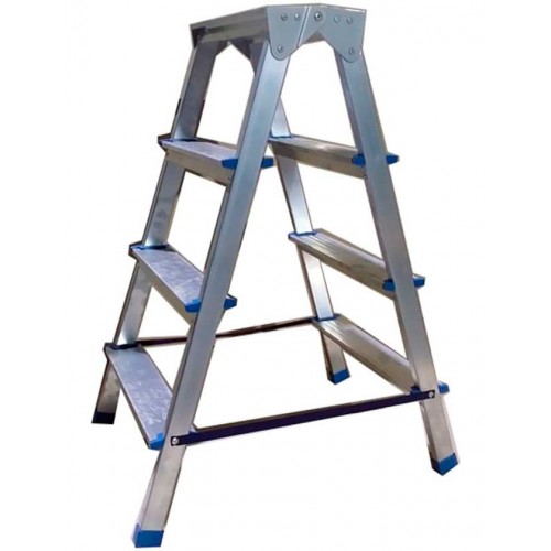 Лестница-стремянка двусторонняя предназначена для различных работ на высоте. Лестница может использоваться в качестве стремянки или помоста. Устанавливается без опоры к стене. Общая высота лестницы — 3 м. Для предотвращения разъезжания боковые профили каркаса соединяются между собой шнуром. Максимальная нагрузка — 150 кг. Выполнена из алюминия, устойчива к коррозии.