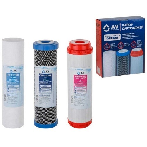 Набор картриджей. 3 шт. AV Engineering Optima . арт.AVE-FS3-2 предназначен для предварительной очистки хозяйственной технической воды от крупных взвесей: песка, ржавчины, других нерастворимых частиц, для сорбционной очистки воды от свободного хлора, пестицидов, органических соединений, для осветления, обесцвечивания и обезжелезивания воды.