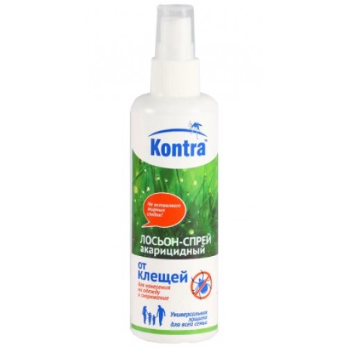Лосьон-спрей KONTRA от клещей 100мл 010501 Эффективно защищает людей от иксодовых клещей (переносчиков возбудителей опасных заболеваний человека) при обработке одежды и других изделий из ткани (занавесей, противомоски... Читать далее...