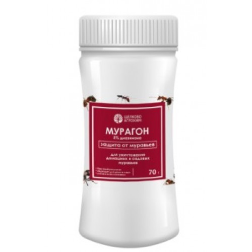 Мурагон флакон 70 г - инсектицидное средство для уничтожения синантропных муравьёв (рыжих домовых, черных садовых и других видов) в помещениях различного назначения.